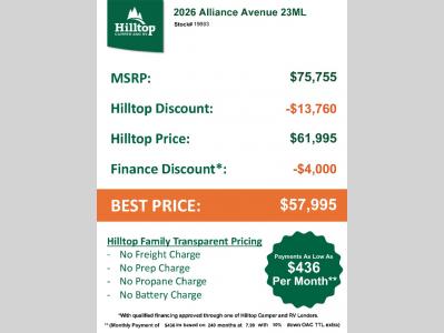 Hilltop Camper & RV is not responsible for any misprints, typos, or errors found in our website pages. Any price listed excludes sales tax, registration tags, and delivery fees. Manufacturer pictures, specifications, virtual tours, and features may be used in place of actual units on our lot. Please click here to contact us for availability as our inventory changes rapidly. All calculated payments are an estimate only and do not constitute a commitment that financing or a specific interest rate or term is available. Monthly payments based on 8.99% interest rate and a down payment of 10% not including tax, title, and license.
