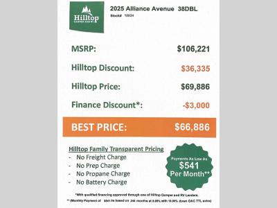 Hilltop Camper & RV is not responsible for any misprints, typos, or errors found in our website pages. Any price listed excludes sales tax, registration tags, and delivery fees. Manufacturer pictures, specifications, virtual tours, and features may be used in place of actual units on our lot. Please click here to contact us for availability as our inventory changes rapidly. All calculated payments are an estimate only and do not constitute a commitment that financing or a specific interest rate or term is available. Monthly payments based on 8.99% interest rate and a down payment of 10% not including tax, title, and license.