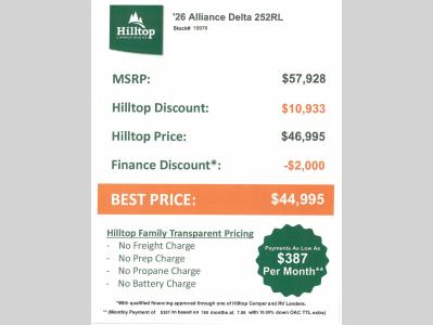 Hilltop Camper & RV is not responsible for any misprints, typos, or errors found in our website pages. Any price listed excludes sales tax, registration tags, and delivery fees. Manufacturer pictures, specifications, virtual tours, and features may be used in place of actual units on our lot. Please click here to contact us for availability as our inventory changes rapidly. All calculated payments are an estimate only and do not constitute a commitment that financing or a specific interest rate or term is available. Monthly payments based on 8.99% interest rate and a down payment of 10% not including tax, title, and license.