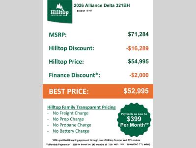 Hilltop Camper & RV is not responsible for any misprints, typos, or errors found in our website pages. Any price listed excludes sales tax, registration tags, and delivery fees. Manufacturer pictures, specifications, virtual tours, and features may be used in place of actual units on our lot. Please click here to contact us for availability as our inventory changes rapidly. All calculated payments are an estimate only and do not constitute a commitment that financing or a specific interest rate or term is available. Monthly payments based on 8.99% interest rate and a down payment of 10% not including tax, title, and license.