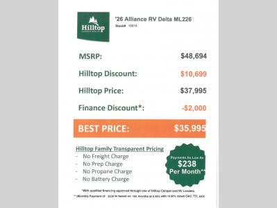 Hilltop Camper & RV is not responsible for any misprints, typos, or errors found in our website pages. Any price listed excludes sales tax, registration tags, and delivery fees. Manufacturer pictures, specifications, virtual tours, and features may be used in place of actual units on our lot. Please click here to contact us for availability as our inventory changes rapidly. All calculated payments are an estimate only and do not constitute a commitment that financing or a specific interest rate or term is available. Monthly payments based on 8.99% interest rate and a down payment of 10% not including tax, title, and license.
