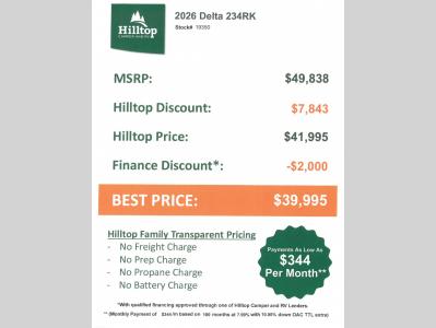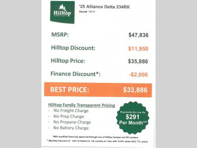 Hilltop Camper & RV is not responsible for any misprints, typos, or errors found in our website pages. Any price listed excludes sales tax, registration tags, and delivery fees. Manufacturer pictures, specifications, virtual tours, and features may be used in place of actual units on our lot. Please click here to contact us for availability as our inventory changes rapidly. All calculated payments are an estimate only and do not constitute a commitment that financing or a specific interest rate or term is available. Monthly payments based on 8.99% interest rate and a down payment of 10% not including tax, title, and license.