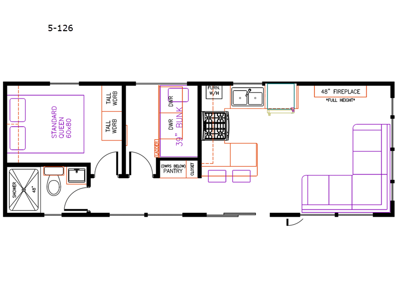 This park model with a private bedroom and bunkhouse is sure to be a hit with your friends and family! There is a queen bed and tall wardrobes in the bedroom plus a 39" bunk bed with drawers underneath in the bunkhouse. A full bath with a 48" shower will let everyone stay clean each day, and there is a pantry with drawers and a closet to keep snacks, board games, and towels close by. Everyone can meet in the front living room on the L-shaped sofa while the chef of your group makes dinner in the full kitchen!
