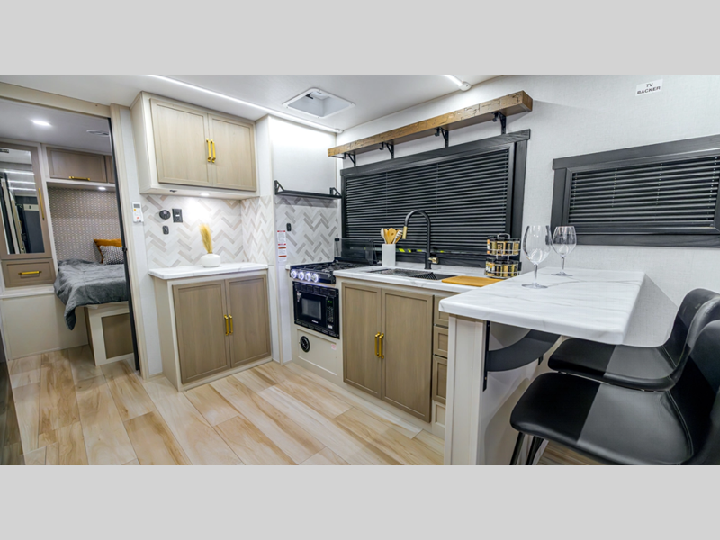 Sleeps 3 Slides 1 Length 30 ft 10 in Ext Width 8 ft Ext Height 10 ft 10 in Hitch Weight 920 lbs Dry Weight 6678 lbs Cargo Capacity 1242 lbs Fresh Water Capacity 49 gals Grey Water Capacity 62 gals Black Water Capacity 32 gals Available Beds Queen with Versa Tilt Refrigerator Type 12V Black Refrigerator Size 10 cu ft Cooktop Burners 3 Shower Size 30" x 36" Number of Awnings 1 Water Heater Type On Demand Tankless AC BTU 18000 btu TV Info LR 40" LED Smart TV Awning Info 18' w/LED Lights Axle Count 2 Shower Type Walk-In Shower Similar Floorplans
