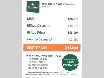 Hilltop Camper & RV is not responsible for any misprints, typos, or errors found in our website pages. Any price listed excludes sales tax, registration tags, and delivery fees. Manufacturer pictures, specifications, virtual tours, and features may be used in place of actual units on our lot. Please click here to contact us for availability as our inventory changes rapidly. All calculated payments are an estimate only and do not constitute a commitment that financing or a specific interest rate or term is available. Monthly payments based on 7.99% interest rate and a down payment of 10% not including tax, title, and license.