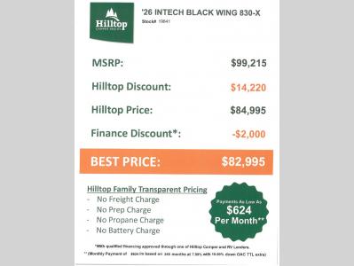 Hilltop Camper & RV is not responsible for any misprints, typos, or errors found in our website pages. Any price listed excludes sales tax, registration tags, and delivery fees. Manufacturer pictures, specifications, virtual tours, and features may be used in place of actual units on our lot. Please click here to contact us for availability as our inventory changes rapidly. All calculated payments are an estimate only and do not constitute a commitment that financing or a specific interest rate or term is available. Monthly payments based on 8.99% interest rate and a down payment of 10% not including tax, title, and license.