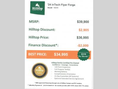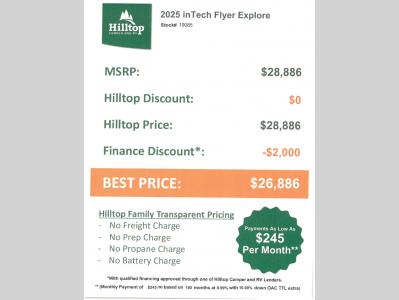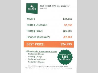 Hilltop Camper & RV is not responsible for any misprints, typos, or errors found in our website pages. Any price listed excludes sales tax, registration tags, and delivery fees. Manufacturer pictures, specifications, virtual tours, and features may be used in place of actual units on our lot. Please click here to contact us for availability as our inventory changes rapidly. All calculated payments are an estimate only and do not constitute a commitment that financing or a specific interest rate or term is available. Monthly payments based on 8.99% interest rate and a down payment of 10% not including tax, title, and license.