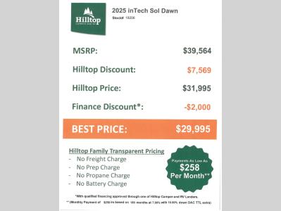 Hilltop Camper & RV is not responsible for any misprints, typos, or errors found in our website pages. Any price listed excludes sales tax, registration tags, and delivery fees. Manufacturer pictures, specifications, virtual tours, and features may be used in place of actual units on our lot. Please click here to contact us for availability as our inventory changes rapidly. All calculated payments are an estimate only and do not constitute a commitment that financing or a specific interest rate or term is available. Monthly payments based on 7.99% interest rate and a down payment of 10% not including tax, title, and license.