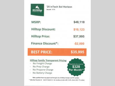 Hilltop Camper & RV is not responsible for any misprints, typos, or errors found in our website pages. Any price listed excludes sales tax, registration tags, and delivery fees. Manufacturer pictures, specifications, virtual tours, and features may be used in place of actual units on our lot. Please click here to contact us for availability as our inventory changes rapidly. All calculated payments are an estimate only and do not constitute a commitment that financing or a specific interest rate or term is available. Monthly payments based on 8.99% interest rate and a down payment of 10% not including tax, title, and license.