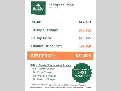 Hilltop Camper & RV is not responsible for any misprints, typos, or errors found in our website pages. Any price listed excludes sales tax, registration tags, and delivery fees. Manufacturer pictures, specifications, virtual tours, and features may be used in place of actual units on our lot. Please click here to contact us for availability as our inventory changes rapidly. All calculated payments are an estimate only and do not constitute a commitment that financing or a specific interest rate or term is available. Monthly payments based on 8.99% interest rate and a down payment of 10% not including tax, title, and license.