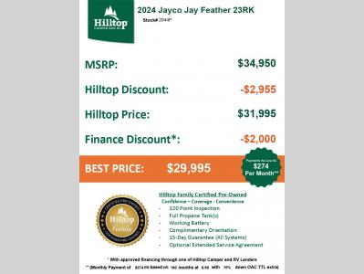Hilltop Camper & RV is not responsible for any misprints, typos, or errors found in our website pages. Any price listed excludes sales tax, registration tags, and delivery fees. Manufacturer pictures, specifications, virtual tours, and features may be used in place of actual units on our lot. Please click here to contact us for availability as our inventory changes rapidly. All calculated payments are an estimate only and do not constitute a commitment that financing or a specific interest rate or term is available. Monthly payments based on 8.99% interest rate and a down payment of 10% not including tax, title, and license.