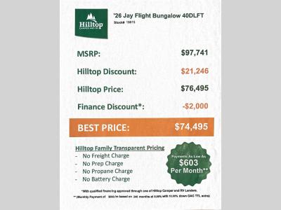 Hilltop Camper & RV is not responsible for any misprints, typos, or errors found in our website pages. Any price listed excludes sales tax, registration tags, and delivery fees. Manufacturer pictures, specifications, virtual tours, and features may be used in place of actual units on our lot. Please click here to contact us for availability as our inventory changes rapidly. All calculated payments are an estimate only and do not constitute a commitment that financing or a specific interest rate or term is available. Monthly payments based on 8.99% interest rate and a down payment of 10% not including tax, title, and license.