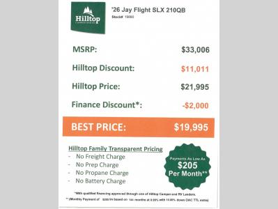 Hilltop Camper & RV is not responsible for any misprints, typos, or errors found in our website pages. Any price listed excludes sales tax, registration tags, and delivery fees. Manufacturer pictures, specifications, virtual tours, and features may be used in place of actual units on our lot. Please click here to contact us for availability as our inventory changes rapidly. All calculated payments are an estimate only and do not constitute a commitment that financing or a specific interest rate or term is available. Monthly payments based on 8.99% interest rate and a down payment of 10% not including tax, title, and license.