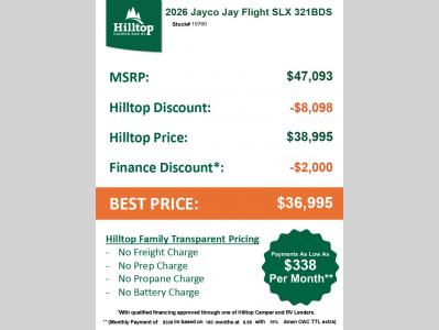Hilltop Camper & RV is not responsible for any misprints, typos, or errors found in our website pages. Any price listed excludes sales tax, registration tags, and delivery fees. Manufacturer pictures, specifications, virtual tours, and features may be used in place of actual units on our lot. Please click here to contact us for availability as our inventory changes rapidly. All calculated payments are an estimate only and do not constitute a commitment that financing or a specific interest rate or term is available. Monthly payments based on 8.99% interest rate and a down payment of 10% not including tax, title, and license.