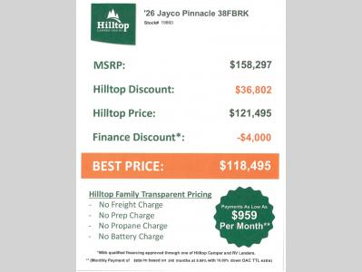 Hilltop Camper & RV is not responsible for any misprints, typos, or errors found in our website pages. Any price listed excludes sales tax, registration tags, and delivery fees. Manufacturer pictures, specifications, virtual tours, and features may be used in place of actual units on our lot. Please click here to contact us for availability as our inventory changes rapidly. All calculated payments are an estimate only and do not constitute a commitment that financing or a specific interest rate or term is available. Monthly payments based on 8.99% interest rate and a down payment of 10% not including tax, title, and license.