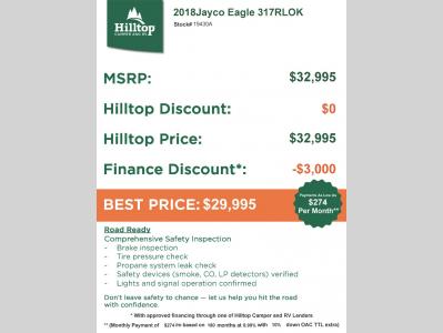 Hilltop Camper & RV is not responsible for any misprints, typos, or errors found in our website pages. Any price listed excludes sales tax, registration tags, and delivery fees. Manufacturer pictures, specifications, virtual tours, and features may be used in place of actual units on our lot. Please click here to contact us for availability as our inventory changes rapidly. All calculated payments are an estimate only and do not constitute a commitment that financing or a specific interest rate or term is available. Monthly payments based on 8.99% interest rate and a down payment of 10% not including tax, title, and license.