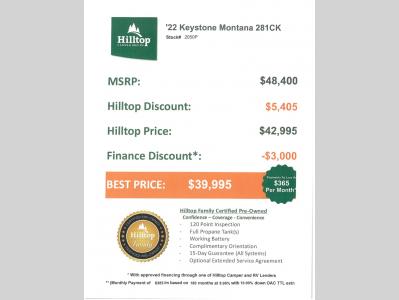 Hilltop Camper & RV is not responsible for any misprints, typos, or errors found in our website pages. Any price listed excludes sales tax, registration tags, and delivery fees. Manufacturer pictures, specifications, virtual tours, and features may be used in place of actual units on our lot. Please click here to contact us for availability as our inventory changes rapidly. All calculated payments are an estimate only and do not constitute a commitment that financing or a specific interest rate or term is available. Monthly payments based on 8.99% interest rate and a down payment of 10% not including tax, title, and license.