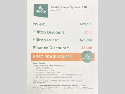 Hilltop Camper & RV is not responsible for any misprints, typos, or errors found in our website pages. Any price listed excludes sales tax, registration tags, and delivery fees. Manufacturer pictures, specifications, virtual tours, and features may be used in place of actual units on our lot. Please click here to contact us for availability as our inventory changes rapidly. All calculated payments are an estimate only and do not constitute a commitment that financing or a specific interest rate or term is available. Monthly payments based on 8.99% interest rate and a down payment of 10% not including tax, title, and license.