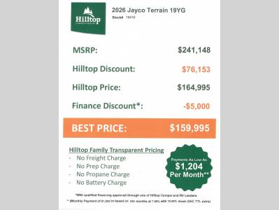 Hilltop Camper & RV is not responsible for any misprints, typos, or errors found in our website pages. Any price listed excludes sales tax, registration tags, and delivery fees. Manufacturer pictures, specifications, virtual tours, and features may be used in place of actual units on our lot. Please click here to contact us for availability as our inventory changes rapidly. All calculated payments are an estimate only and do not constitute a commitment that financing or a specific interest rate or term is available. Monthly payments based on 8.99% interest rate and a down payment of 10% not including tax, title, and license.