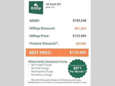 Hilltop Camper & RV is not responsible for any misprints, typos, or errors found in our website pages. Any price listed excludes sales tax, registration tags, and delivery fees. Manufacturer pictures, specifications, virtual tours, and features may be used in place of actual units on our lot. Please click here to contact us for availability as our inventory changes rapidly. All calculated payments are an estimate only and do not constitute a commitment that financing or a specific interest rate or term is available. Monthly payments based on 8.99% interest rate and a down payment of 10% not including tax, title, and license.