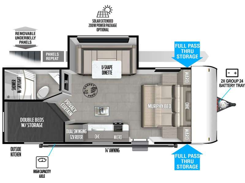 MAX COLD WEATHER Package: 12V Heated Tank Pads on all Holding Tanks (Fresh, Grey, and Black) w/ AutoStart below 48°F + Fully Enclosed Underbelly Using Industry Leading AccessiBelly Panels + Insulated Flooring for Heat Capture and Deflection
