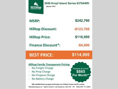 Hilltop Camper & RV is not responsible for any misprints, typos, or errors found in our website pages. Any price listed excludes sales tax, registration tags, and delivery fees. Manufacturer pictures, specifications, virtual tours, and features may be used in place of actual units on our lot. Please click here to contact us for availability as our inventory changes rapidly. All calculated payments are an estimate only and do not constitute a commitment that financing or a specific interest rate or term is available. Monthly payments based on 7.99% interest rate and a down payment of 10% not including tax, title, and license.