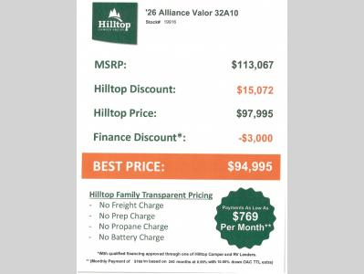 Hilltop Camper & RV is not responsible for any misprints, typos, or errors found in our website pages. Any price listed excludes sales tax, registration tags, and delivery fees. Manufacturer pictures, specifications, virtual tours, and features may be used in place of actual units on our lot. Please click here to contact us for availability as our inventory changes rapidly. All calculated payments are an estimate only and do not constitute a commitment that financing or a specific interest rate or term is available. Monthly payments based on 8.99% interest rate and a down payment of 10% not including tax, title, and license.