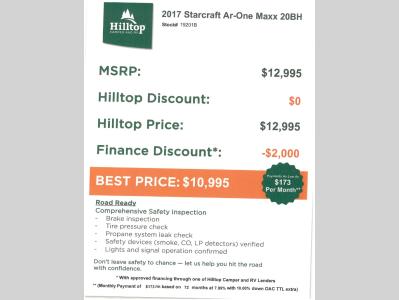 Hilltop Camper & RV is not responsible for any misprints, typos, or errors found in our website pages. Any price listed excludes sales tax, registration tags, and delivery fees. Manufacturer pictures, specifications, virtual tours, and features may be used in place of actual units on our lot. Please click here to contact us for availability as our inventory changes rapidly. All calculated payments are an estimate only and do not constitute a commitment that financing or a specific interest rate or term is available. Monthly payments based on 8.99% interest rate and a down payment of 10% not including tax, title, and license.