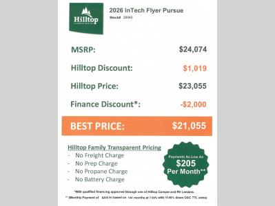 Hilltop Camper & RV is not responsible for any misprints, typos, or errors found in our website pages. Any price listed excludes sales tax, registration tags, and delivery fees. Manufacturer pictures, specifications, virtual tours, and features may be used in place of actual units on our lot. Please click here to contact us for availability as our inventory changes rapidly. All calculated payments are an estimate only and do not constitute a commitment that financing or a specific interest rate or term is available. Monthly payments based on 8.99% interest rate and a down payment of 10% not including tax, title, and license.