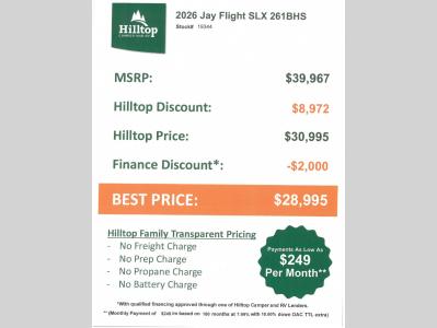 Hilltop Camper & RV is not responsible for any misprints, typos, or errors found in our website pages. Any price listed excludes sales tax, registration tags, and delivery fees. Manufacturer pictures, specifications, virtual tours, and features may be used in place of actual units on our lot. Please click here to contact us for availability as our inventory changes rapidly. All calculated payments are an estimate only and do not constitute a commitment that financing or a specific interest rate or term is available. Monthly payments based on 8.99% interest rate and a down payment of 10% not including tax, title, and license.
