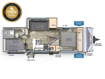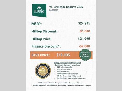 Hilltop Camper & RV is not responsible for any misprints, typos, or errors found in our website pages. Any price listed excludes sales tax, registration tags, and delivery fees. Manufacturer pictures, specifications, virtual tours, and features may be used in place of actual units on our lot. Please click here to contact us for availability as our inventory changes rapidly. All calculated payments are an estimate only and do not constitute a commitment that financing or a specific interest rate or term is available. Monthly payments based on 8.99% interest rate and a down payment of 10% not including tax, title, and license.