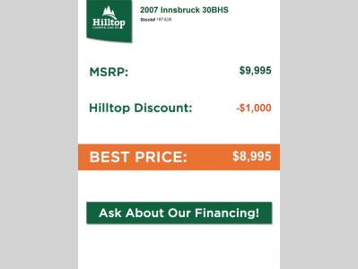 Hilltop Camper & RV is not responsible for any misprints, typos, or errors found in our website pages. Any price listed excludes sales tax, registration tags, and delivery fees. Manufacturer pictures, specifications, virtual tours, and features may be used in place of actual units on our lot. Please click here to contact us for availability as our inventory changes rapidly. All calculated payments are an estimate only and do not constitute a commitment that financing or a specific interest rate or term is available. Monthly payments based on 8.99% interest rate and a down payment of 10% not including tax, title, and license.
