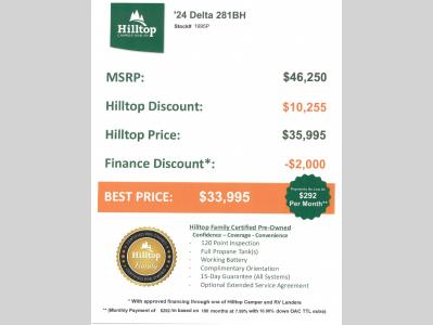 Hilltop Camper & RV is not responsible for any misprints, typos, or errors found in our website pages. Any price listed excludes sales tax, registration tags, and delivery fees. Manufacturer pictures, specifications, virtual tours, and features may be used in place of actual units on our lot. Please click here to contact us for availability as our inventory changes rapidly. All calculated payments are an estimate only and do not constitute a commitment that financing or a specific interest rate or term is available. Monthly payments based on 8.99% interest rate and a down payment of 10% not including tax, title, and license.
