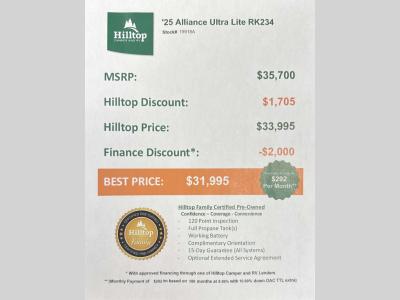 Hilltop Camper & RV is not responsible for any misprints, typos, or errors found in our website pages. Any price listed excludes sales tax, registration tags, and delivery fees. Manufacturer pictures, specifications, virtual tours, and features may be used in place of actual units on our lot. Please click here to contact us for availability as our inventory changes rapidly. All calculated payments are an estimate only and do not constitute a commitment that financing or a specific interest rate or term is available. Monthly payments based on 8.99% interest rate and a down payment of 10% not including tax, title, and license.