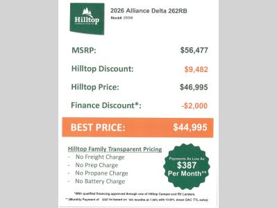 Hilltop Camper & RV is not responsible for any misprints, typos, or errors found in our website pages. Any price listed excludes sales tax, registration tags, and delivery fees. Manufacturer pictures, specifications, virtual tours, and features may be used in place of actual units on our lot. Please click here to contact us for availability as our inventory changes rapidly. All calculated payments are an estimate only and do not constitute a commitment that financing or a specific interest rate or term is available. Monthly payments based on 8.99% interest rate and a down payment of 10% not including tax, title, and license.
