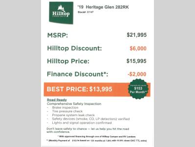 Hilltop Camper & RV is not responsible for any misprints, typos, or errors found in our website pages. Any price listed excludes sales tax, registration tags, and delivery fees. Manufacturer pictures, specifications, virtual tours, and features may be used in place of actual units on our lot. Please click here to contact us for availability as our inventory changes rapidly. All calculated payments are an estimate only and do not constitute a commitment that financing or a specific interest rate or term is available. Monthly payments based on 8.99% interest rate and a down payment of 10% not including tax, title, and license.