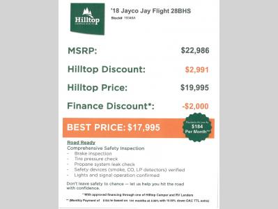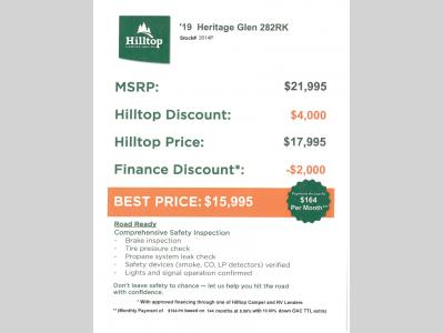 Hilltop Camper & RV is not responsible for any misprints, typos, or errors found in our website pages. Any price listed excludes sales tax, registration tags, and delivery fees. Manufacturer pictures, specifications, virtual tours, and features may be used in place of actual units on our lot. Please click here to contact us for availability as our inventory changes rapidly. All calculated payments are an estimate only and do not constitute a commitment that financing or a specific interest rate or term is available. Monthly payments based on 8.99% interest rate and a down payment of 10% not including tax, title, and license.