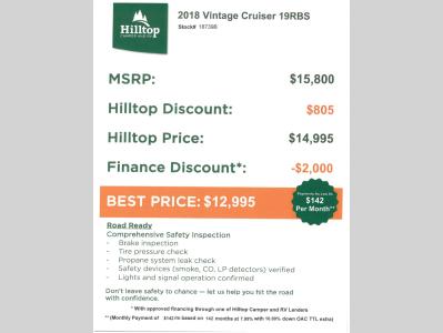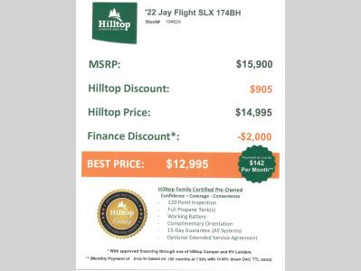 Hilltop Camper & RV is not responsible for any misprints, typos, or errors found in our website pages. Any price listed excludes sales tax, registration tags, and delivery fees. Manufacturer pictures, specifications, virtual tours, and features may be used in place of actual units on our lot. Please click here to contact us for availability as our inventory changes rapidly. All calculated payments are an estimate only and do not constitute a commitment that financing or a specific interest rate or term is available. Monthly payments based on 8.99% interest rate and a down payment of 10% not including tax, title, and license.