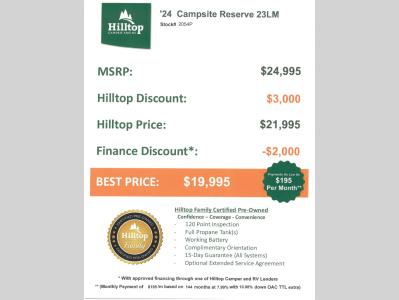 Hilltop Camper & RV is not responsible for any misprints, typos, or errors found in our website pages. Any price listed excludes sales tax, registration tags, and delivery fees. Manufacturer pictures, specifications, virtual tours, and features may be used in place of actual units on our lot. Please click here to contact us for availability as our inventory changes rapidly. All calculated payments are an estimate only and do not constitute a commitment that financing or a specific interest rate or term is available. Monthly payments based on 8.99% interest rate and a down payment of 10% not including tax, title, and license.