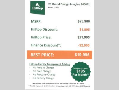 Hilltop Camper & RV is not responsible for any misprints, typos, or errors found in our website pages. Any price listed excludes sales tax, registration tags, and delivery fees. Manufacturer pictures, specifications, virtual tours, and features may be used in place of actual units on our lot. Please click here to contact us for availability as our inventory changes rapidly. All calculated payments are an estimate only and do not constitute a commitment that financing or a specific interest rate or term is available. Monthly payments based on 8.99% interest rate and a down payment of 10% not including tax, title, and license.