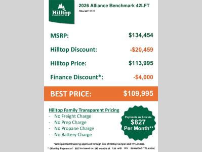 Hilltop Camper & RV is not responsible for any misprints, typos, or errors found in our website pages. Any price listed excludes sales tax, registration tags, and delivery fees. Manufacturer pictures, specifications, virtual tours, and features may be used in place of actual units on our lot. Please click here to contact us for availability as our inventory changes rapidly. All calculated payments are an estimate only and do not constitute a commitment that financing or a specific interest rate or term is available. Monthly payments based on 8.99% interest rate and a down payment of 10% not including tax, title, and license.